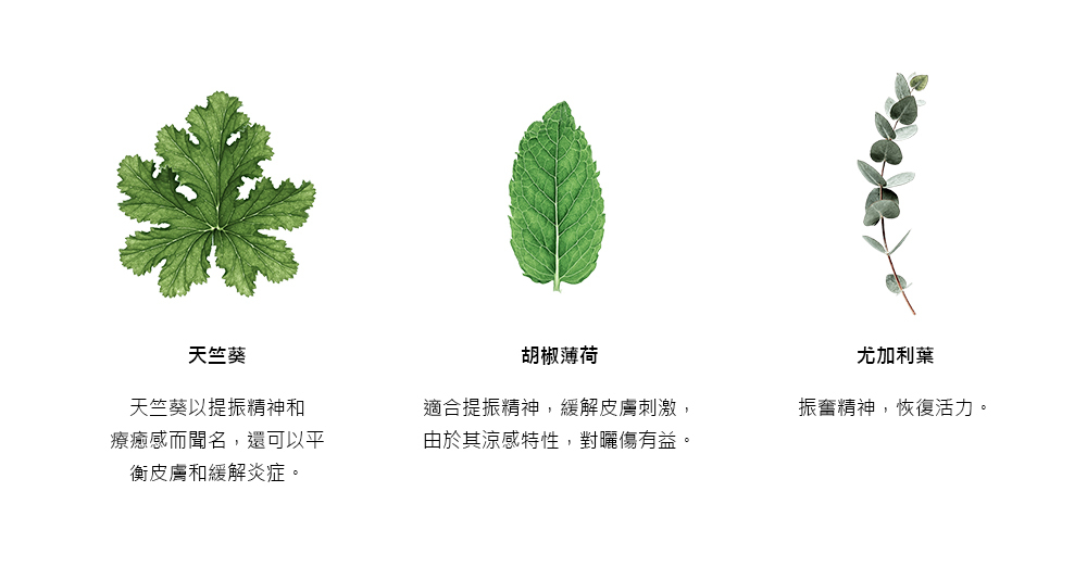 埃及天竺葵的草本中心香調加上薰衣草、辛香的東加豆並點綴了一點胡椒薄荷和藍膠尤佳利的氣味,沐浴時活化身心,帶來平衡舒緩。