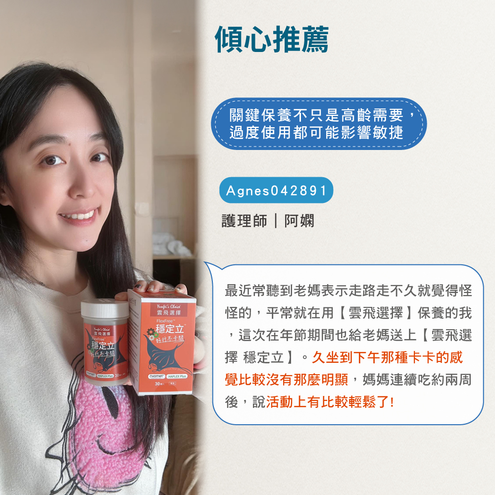 穩定立同時添加關鍵基質珍貴因子──蛋白聚醣,為行動力再加分。HAPLEX Plus玻尿酸,提供深度潤滑。美國OptiMSM優質硫,滋養關鍵組織。甘胺酸鈣鞏固基底,5 in 1,複方營養+行動順暢一次搞定,讓你無懼跑跳,好行不卡關。