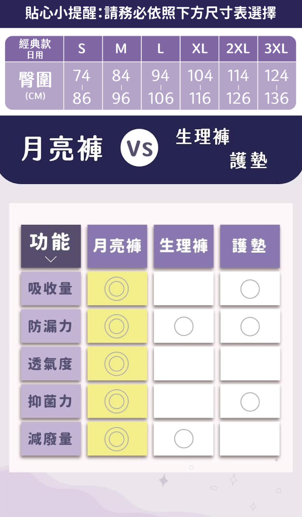 A:一般生理褲只有防漏的功能,月亮褲則是有吸收排汗的功能,可完全取代衛生棉,而不會悶熱,讓你安心每個月的內褲。