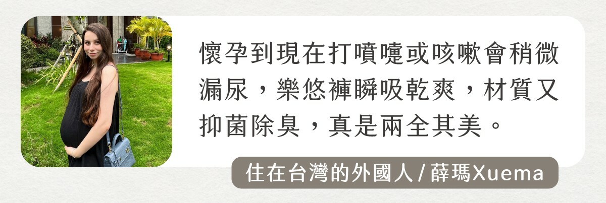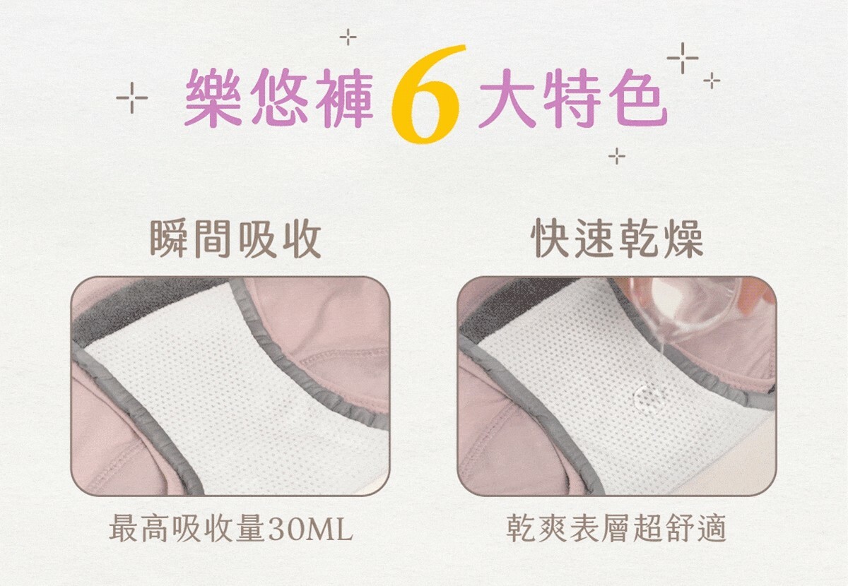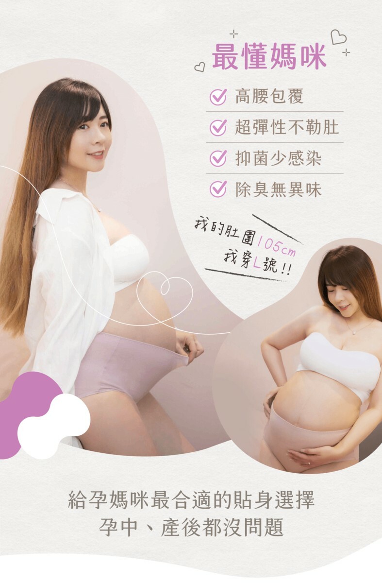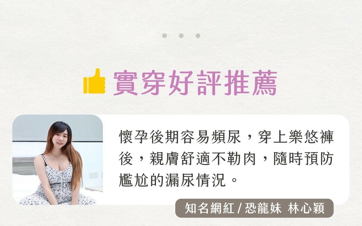 懷孕期間隨著時間肚子越來越大,寶寶的重量加上在肚子裡的活躍,壓迫到膀胱就好容易想上廁所~~更容易在打噴嚏、咳嗽或是去廁所的路上就漏了一兩滴(好崩潰...)樂悠褲的親膚瞬吸、抑菌除臭,讓媽咪可以不用擔心漏尿的困擾,是媽咪在孕中和產後最強大的後盾!