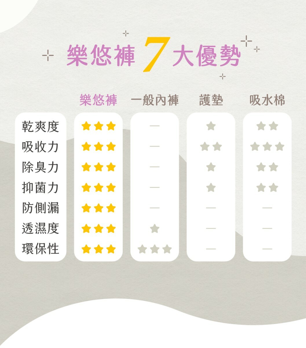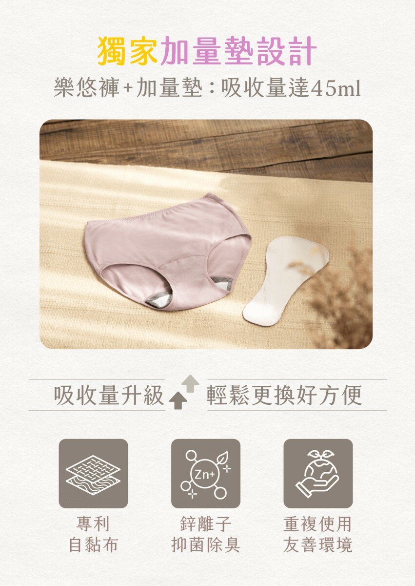 解答:根據我們的問卷調查,有 74% 的女性選擇使用衛生棉或護墊解決漏尿問題,但其實我們可以有更乾爽、更具除臭抑菌,機能性的新選擇:樂悠褲™。