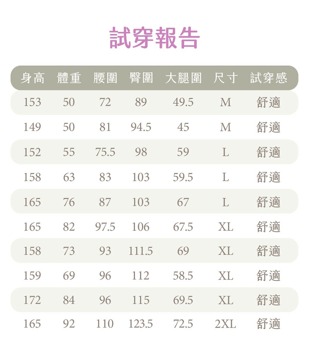 (*穿著舒適度還是依個人感受為主,頁面下方有提供產品尺寸及試穿報告,可以多多參考。)